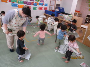 新聞紙を丸めて、ポーン!と投げたり、先生が作った輪っかをハンドル代わりにして車の運転をしたりと、新聞紙がさまざまな形に変化するようすをいっぱい楽しんでいましたよ(^^♪
