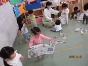 さて、今日のうさぎ組さんは、お部屋で新聞紙を使ってあそびましたよ☆