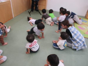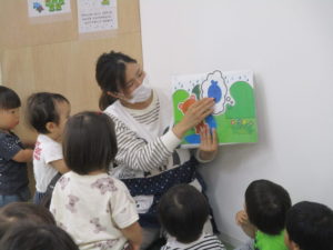見たことのある生き物が登場すると、指差しをしたり、「かえる!」と言葉で伝えたりして、とても興味津々なようすの子どもたちでした(^^♪