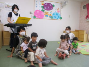 「かえるのがっしょう」では、先生が配ってくれたカエルのイラストを持って楽しく歌ったり、「あめふりくまのこ」では、くまさんのお話のイラストを見ながら、興味を持って歌ったりしています♪
