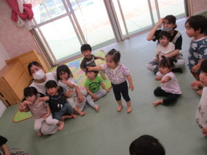 さて、朝のおやつが終わると、みんなの大好きな朝の会が始まりました。