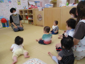 今日はリトミックに参加しました♪リトミックの先生がお部屋に入ってくると、「なにがはじまるのかな?」と興味津々で見つめる子どもたち。ピアノの音に合わせて、保育者のお膝の上に順番に座りながら、ゆらゆら~と揺れたり、わらべうた「うまはとしとし」や今月の歌「かえるのうた」をふれあい遊びを楽しみましたよ🎵
