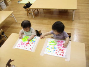 リトミックの後は、春から楽しんできた感触あそび「センサリーバック」の絵の具バージョンを体験したり、園庭に出てお日様や風の心地よさを感じたりしました。