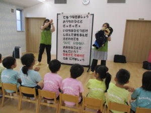 訓練のあとは、らいおん組さんが安全教室に参加しました。知らない人に「おいしいお菓子をあげるよ」「おもちゃを買ってあげるから車においで」「飼っている犬がいなくなったから一緒にさがしてくれない?」などと言葉巧みに誘われるのですが、子どもたちははっきりと「いやだ!」と断ることができていました。