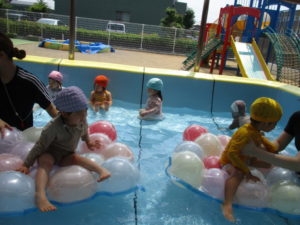 プールでは、昨日風船あそびをした時に作ったバルーンマットを船にしてぷかぷかと浮かばせてみました⛵