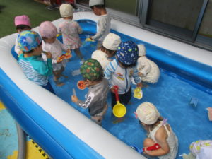 プールが始まったばかりの頃は水が苦手だった子も今ではお尻を付けてあそぶことができるようになっていますよ💕