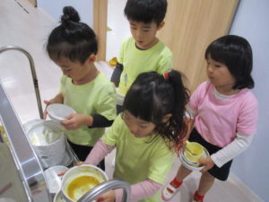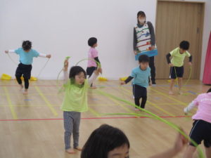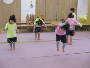 縄を回すとどうしても前に跳んでしまう子が多いですが、頑張って上に跳ぶ練習をしています。