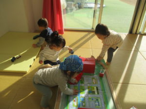 電車遊びでは電車どうしをつなげたり、レールやマットの坂道を走らせたりと、遊び方にも成長を感じる嬉しい毎日です。