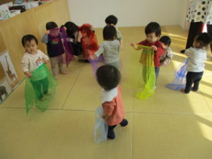 今日はリトミックに参加しました。大きなシフォン布が「おおさむこさむ」の歌に合わせて、みんなのところにビューンと北風さんになって動いてくるのを楽しんだり、一人ひとり色とりどりのシフォン布を貰って、ピアノの音に合わせてダンスもしましたよ。最後はみんなで立って、「ばいばい~」のご挨拶もできました👏