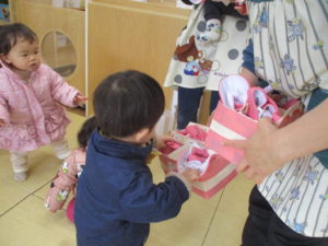 「ぼうし取りにおいで~」と先生が言うと、どれかなどれかな🙄と自分の帽子を探す子どもたち!!