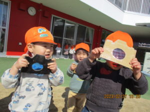うさぎ組さんは園庭で遊びました(^^♪ まずは、前回お部屋の中で楽しんでいた、手作りカメラで遊びましたよ📸