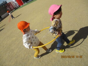 「ぼくの電車に乗って~!!」とお友達を誘ってフラフープ電車を