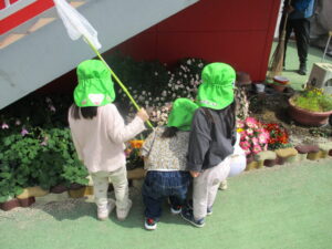 花壇でお花や虫を見ていたお友達も一緒にちょうちょを探したり、春の自然を感じながら、たくさん体を動かして遊びました。