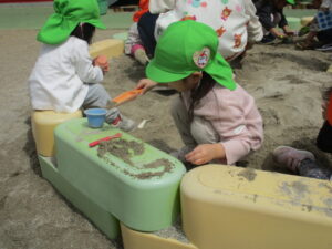 砂場や車に乗ったり、ボールで遊んだり、先生とフープを転がして遊んだり。