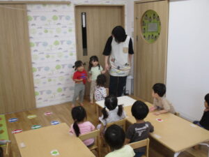 お当番さんを「女の子で、髪の毛を結んでて、お洋服が赤色のお友だち!」と一人ずつヒントを出しながら知らせていくと、「○○ちゃん~!」と嬉しそうに手を上げてやる気満々🔥