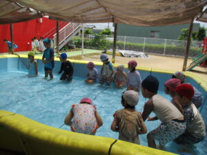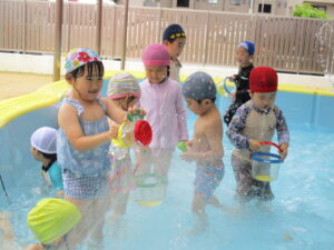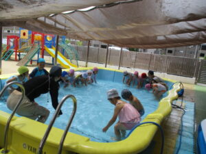 お友だちと水を掛け合ったり、浮いたお魚の玩具を集めたりとのびのびプール遊びを楽しんでいましたよ✨