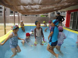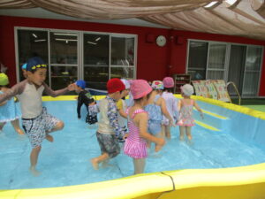 「今日はプールだよ!!」と保育者が伝えると「やったー!!!」と、とっても嬉しそうな子ども達✨