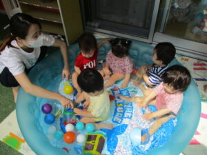 水遊びがお休みの子も、お部屋で体をいっぱい使って楽しみました♪