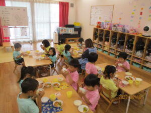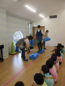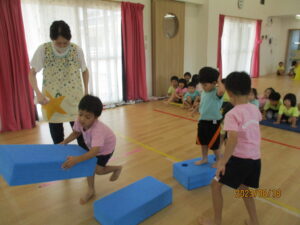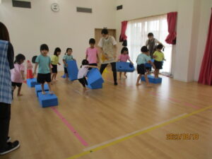 今日のきりん組・ぞう組・らいおん組のグループ活動では、運動会の異年齢競技の練習をしました。