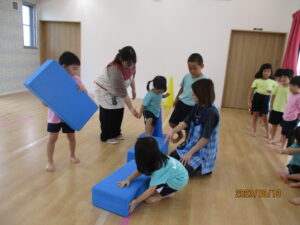 そして、ねこ・うさぎ・くま、それぞれのチームにわかれて練習のスタートです。自分たちでやってみると、なかなかうまくいかなかったのですが、らいおん組さんを中心に、どうやったら他のチームに勝てるか、意見を出し合っていました。素敵ですね✨