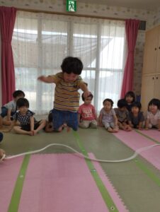 ロープ遊びはあそび方によってバランス感覚を養ったり全身運動からの体力向上にもつながったりするので、今後も活動のなかで取り入れていきたいと思います☺