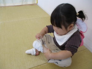 散歩から帰ったら、「靴下ぬぎぬぎだよ」「スッポン」と言葉がけをしながら、脱ぎやすいように