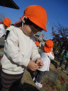 「赤い木の実、みつけたよ」「見て、葉っぱあったよ」と秋の自然の発見を教えてくれるお友だちもいましたよ。