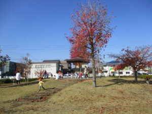 公園に到着すると、木々が色づき、秋らしい色どりの公園内をお友だちと手をつないでお散歩しました。
