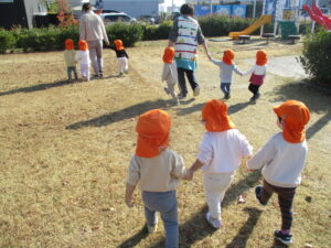 発表会の劇あそびのなかでしている「お友だちと手をつなごう♬」の歌をみんなで歌いながら楽しくお散歩する姿が可愛かったです。