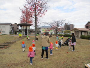 落ち葉を拾い、「みてみてー」とたくさん見せてくれる子供たち。たくさん拾って焚火のように集めている子もいましたよ🍁肌寒かったですが、子供たちは体を動かしてとっても楽しそうでした(*^-^*)