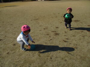 公園につくとボールを「ポーン」と言いながら両手で投げたり、片方の足をあげてボールを