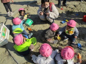 バケツにスコップで少しずつ砂を運んだり、先生が型抜きをして作ったケーキを