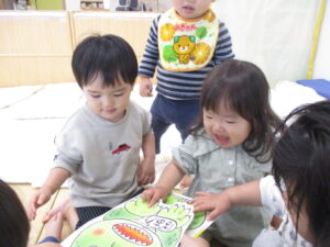 「かいじゅうさんが、いないいない…」と先生が読むと子どもたちも