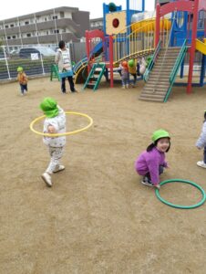 外に出ると、大好きな車に乗ったり、フープを回そうとしたり、