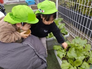 みんなで育てている冬野菜も見に行くと、葉っぱの根元から白いかぶが