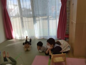 手をおでこにくっつけたり、お友だちとお腹とお腹をくっつけたり、「肘を床にくっつけてみよう」と言われた時には、どうやってくっつけようかなと、考えながら楽しんでいました!