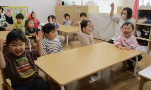 歌の後は、最近のお気に入りの「こすれこすれ」の手遊びを楽しみましたよ。「次はどこをこすって、温まろうか?」と聞くと「からだ!」「あたま!」とリクエストしてくれたり、歌のなかでガッツポーズで「ヘイ!」の掛け声のところが面白くて、みんなで笑い合ったりしています😊