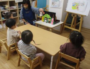 今週は「やすべいじじい」というわらべ歌も楽しんでいます。寒い冬からすこし暖かくなってきたお山にどうぶつたちがやってきて「やすべいじじいは うん ぽんぽん」の歌に合わせて踊ります。揺らし人形のシアターを興味津々で見つめるうさぎ組さん。