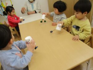 「お人形さんと遊んでみる?」と聞くと「うん」「してみる」と言葉で気持ちを伝えてくれてました。わらべ歌のリズムにのって、たぬきさん人形を揺らしながら笑顔で楽しんでくれていました♪