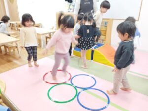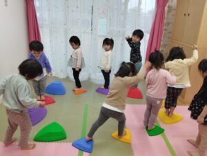 でも体を動かせるあそびがしたい!ということで、ぱんだ組さんはお部屋でサーキット遊びを楽しみました☺