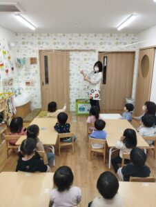 「バンバンつくって、お箸を入れて…間からお兄さん指をこんにちはするよ~」という先生のお話も聞いて、給食前からウキウキ✨