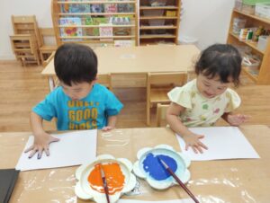 どんどん色が付いていく感じや、手のひらの上の筆の感触をたのしんでいました。