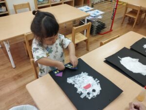 最後は、先に作っていた”おばけ”に顔を付けたり、台紙に家をかざりつけて、今日の作業は終了です!