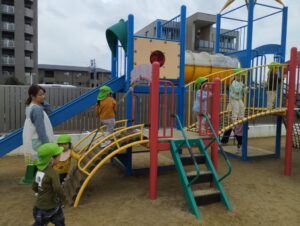 育てている冬野菜に「おおきくなあれ」と水をあげたり、先にあそんでいたきりん組さんと一緒に大型遊具や砂場であそびました。