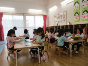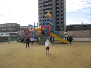 お絵描きの後は園庭であそびました!大型遊具や長縄、警察鬼ごっこなど自分から友だちを誘ってあそびを楽しんでいました!