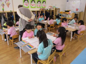 その後はお絵描きをしました!持ってきた色鉛筆でこれまでマーカーで描いた絵をぬりえのようにしたり、文字を描いたりしていました。