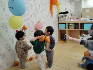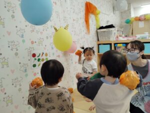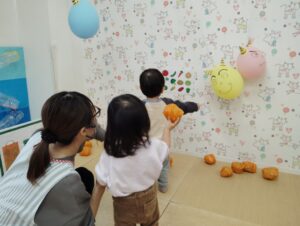 節分ごっこでは、鬼の顔を描いた風船に豆を投げてあそびましたよ♪