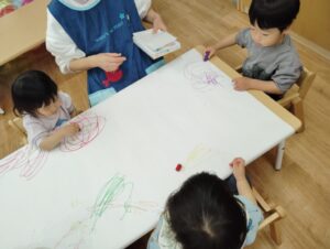 色にもこだわりがでてきた子どもたち。クレヨンの箱から好きな色を選んでダイナミックに描いていましたよ!