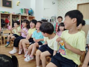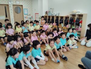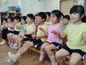 繰り返し同じフレーズが出てくるのを期待して待ったり、お話してくれる先生の指まねをしながら聞いたり、子どもたちの表情もとてもいきいきとしていて、今日も楽しい時間はあっという間に過ぎてしまいました☺