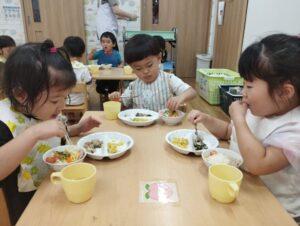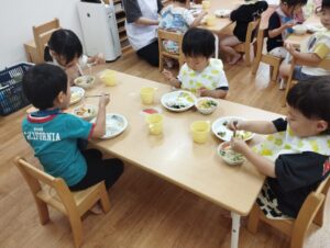 今日の給食は七夕のメニューだったので、ぱんだ組の子どもたちは朝から楽しみにしている様子でした♪